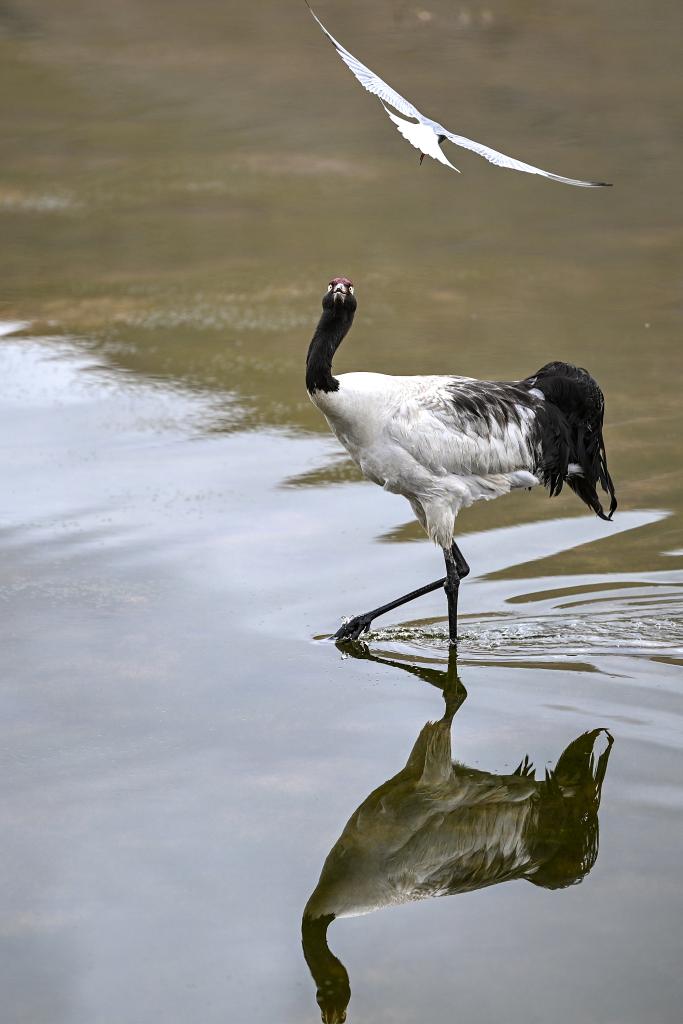 在西藏那曲市申扎县,一只黑颈鹤试图驱赶鸟巢附近活动的渔鸥(2025年6月4日摄)。新华社记者 孙瑞博 摄