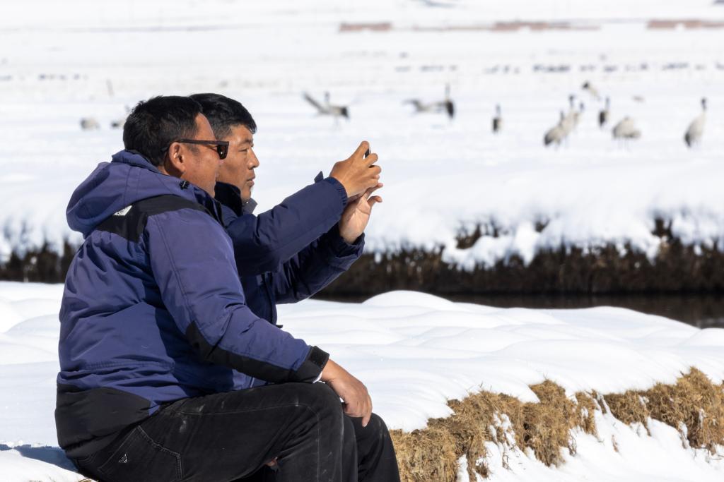 当雄县野生动物疫源疫病监测员尼玛顿珠(左)和同事扎西顿珠在雪后的阿热湿地观察迁徙途中的黑颈鹤(2024年4月7日摄)。 新华社记者 姜帆 摄