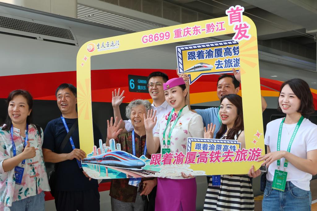 6月27日,搭乘渝厦高铁重庆东至黔江段首发高铁班列的乘客和工作人员在重庆东站站台合影。新华社记者 雷明宇 摄