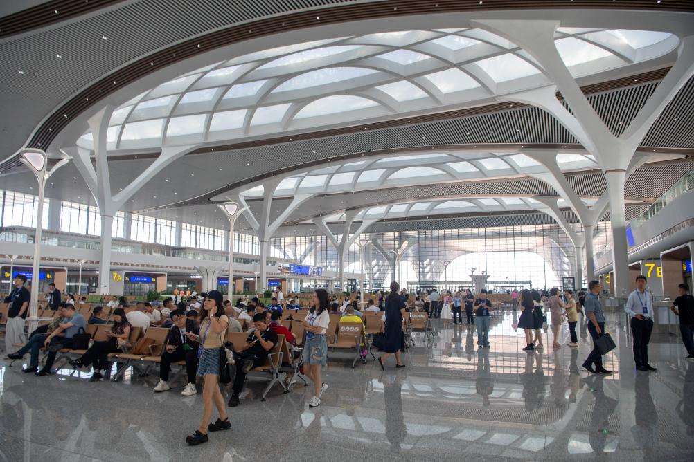 6月27日,搭乘渝厦高铁重庆东至黔江段首发高铁班列的乘客和工作人员在重庆东站候车大厅等待上车。新华社记者 唐奕 摄