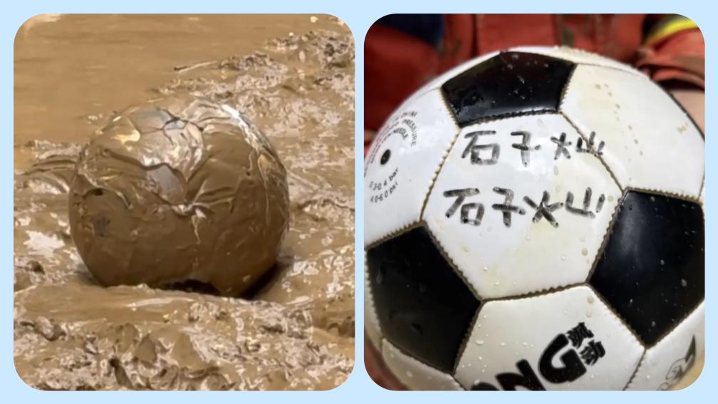 7月1日,在贵州省榕江县灾区的淤泥中,消防员发现了一个足球,洗干净后,上面写着“石子灿”三个字。