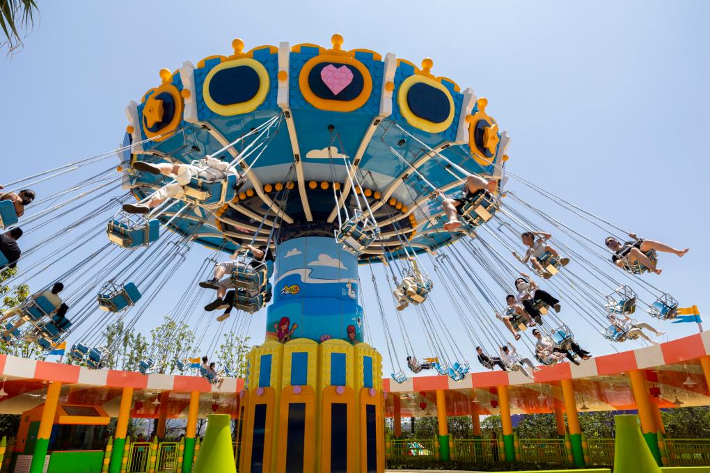 7月5日,游客在上海乐高乐园体验心湖城秋千。新华社记者 王翔 摄