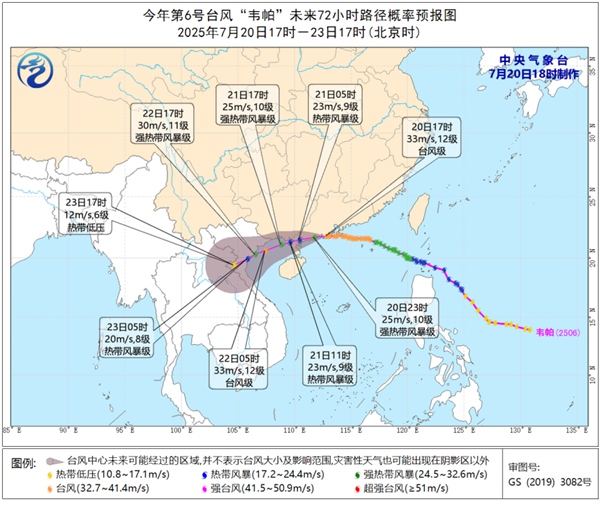 中央气象台预计,7月20日14时至21日14时,广东中南部、香港、澳门、海南岛、广西南部、福建东部、浙江东南部、江西西南部、湖南西南部、台湾岛中南部等地有大到暴雨,其中,广东西南部、香港、澳门、海南岛中北部、广西东南部沿海等地的部分地区有大暴雨,广东西南部、海南岛北部等地局地有特大暴雨;南海北部、广东南部及沿海、珠江口、香港、澳门、雷州半岛及其沿海、广西南部及沿海、北部湾的风力可达8~11级,阵风12~13级,台风中心经过的附近海域和地区的风力有12~14级,阵风15~16级。