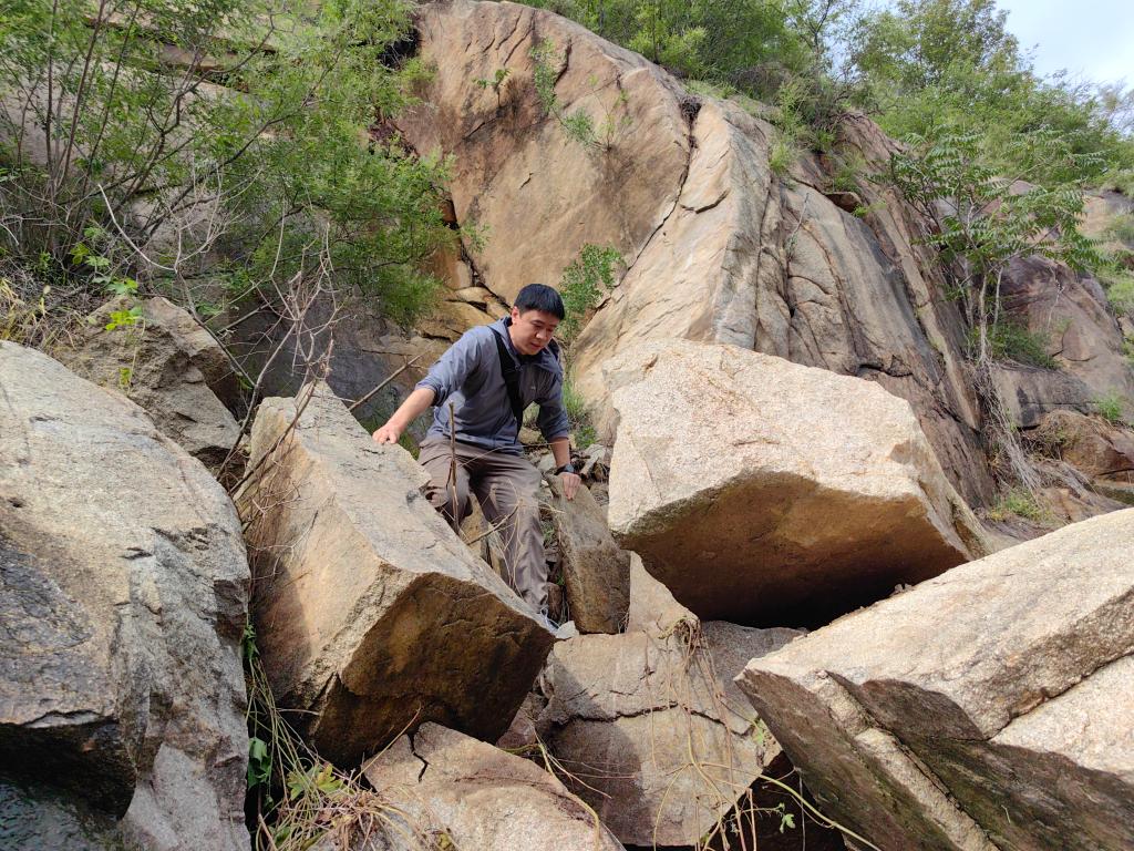 由于道路损毁,新华社记者邵鲁文爬上巨石绕行。新华社记者 陈国峰 摄