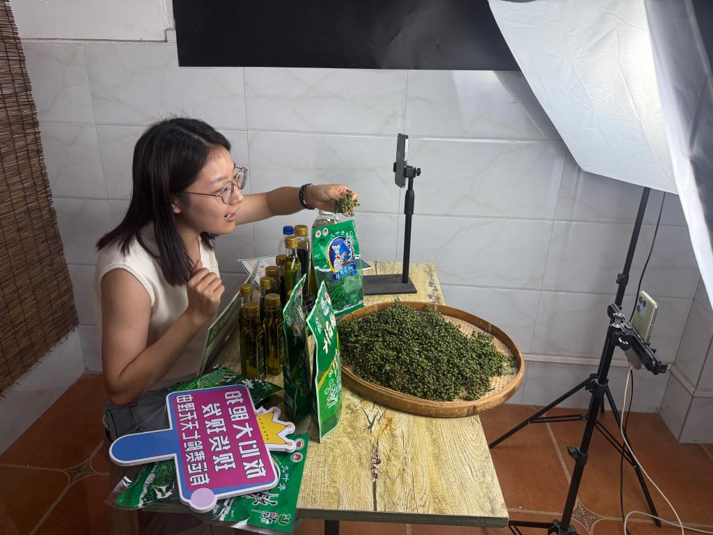 工作人员正在直播销售丰源花椒有限公司的花椒产品。新华社记者 李晓婷 摄