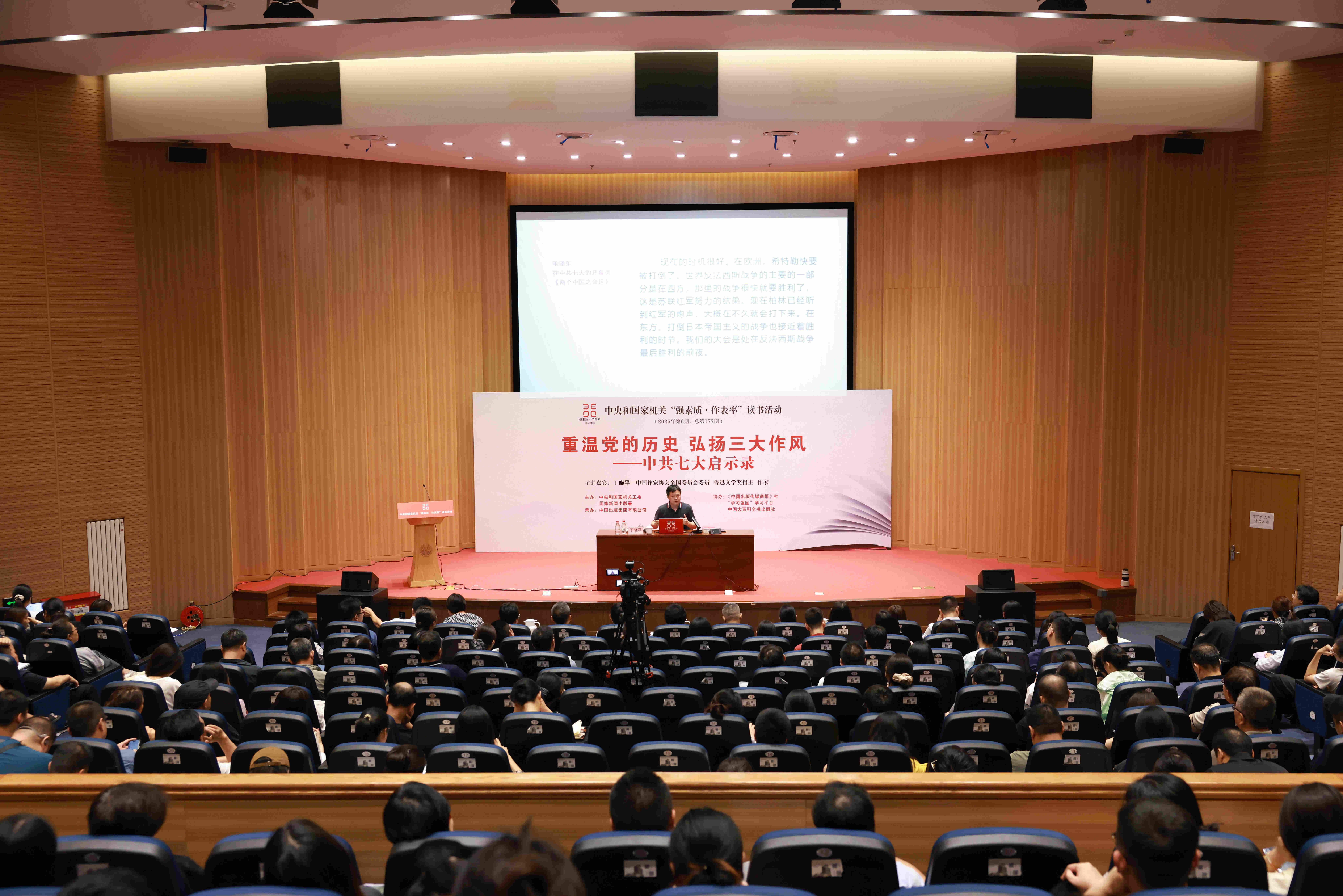 7月28日,中央和国家机关“强素质·作表率”读书活动2025年第6期主题讲座在京举办。中国作家协会全国委员会委员、鲁迅文学奖得主、作家丁晓平以《重温党的历史 弘扬三大作风——中共七大启示录》为题作讲座。中央和国家机关各部门党员干部300余人参加。