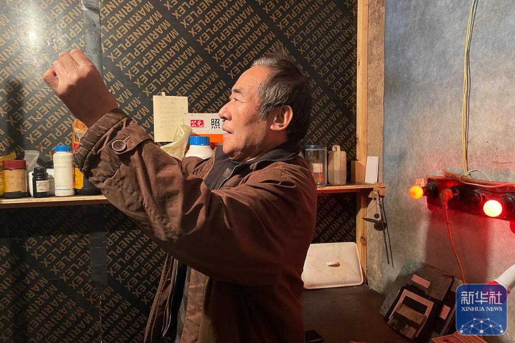 2023年12月9日,魏伟的父亲魏洁雄在阿干照相馆的暗房里查看冲印好的底片。新华社记者 方欣 摄