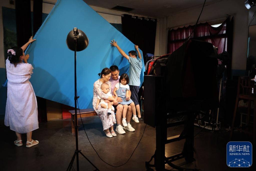 2025年7月29日,魏伟(右一)在阿干照相馆里挪动背景板,准备为几位专门赶来拍照的西安游客拍摄全家福。 新华社记者 陈斌 摄