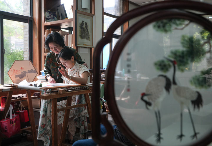 2024年9月10日,中国工艺美术大师赵红育(左)在辅导学生制作无锡精微绣双面绣作品。苏绣(无锡精微绣)于2008年被列入第二批国家级非物质文化遗产。新华社记者 杨磊 摄