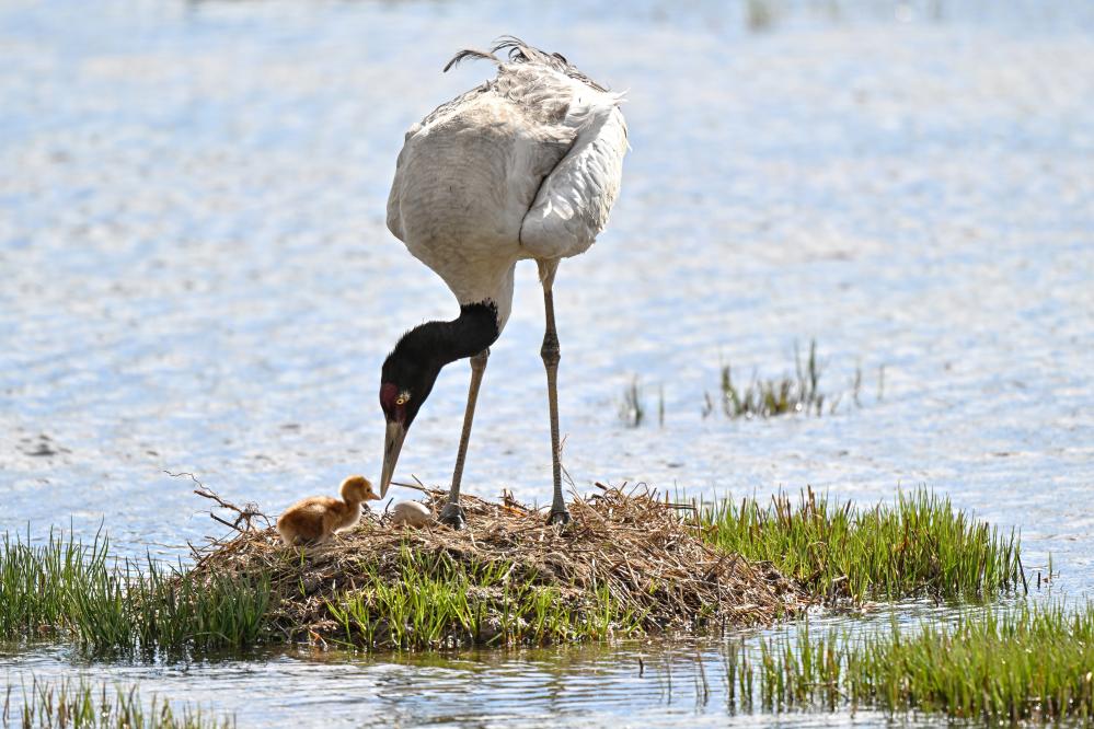 2025年6月5日,这是在西藏那曲市申扎县拍摄的黑颈鹤和雏鸟。新华社记者孙瑞博 摄