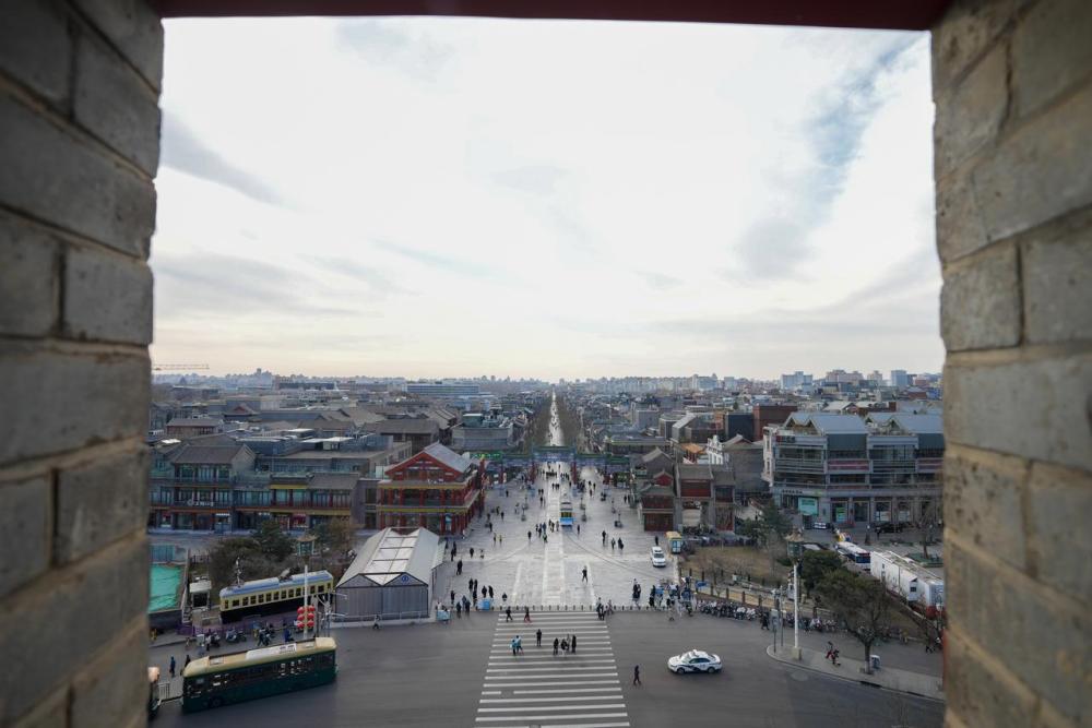 来到鼓楼二层,向南眺望,景山万春亭、北海白塔等清晰映入眼帘。北京老城平缓开阔的空间形态、独有的壮美秩序让法国游客索菲亚感到惊艳。她说:“蓝天白云、古今建筑,构成了一幅无与伦比的美丽画卷。”
