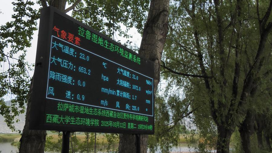 拉鲁湿地国家级自然保护区南门内的生态环境监测系统显示屏,实时显示湿地内的气象要素、土壤和水环境、植被指数等数据。新华社记者 黄智琪 摄