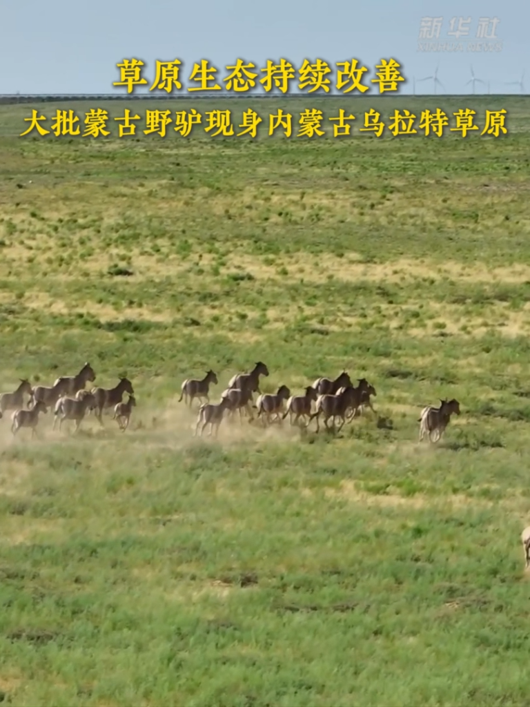 近期,内蒙古乌拉特中旗草原生态持续改善,大批国家一级重点保护野生动物蒙古野驴现身。