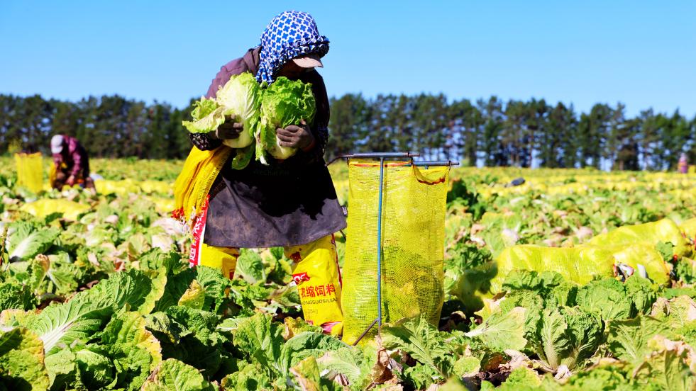 红星农场有限公司第四管理区有机种植基地里工作人员正在收获白菜。新华社发(侯越摄)