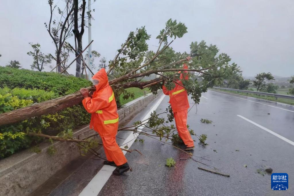 9月19日,公路养护工作人员在清理国道G236线汕尾市捷胜镇路段处的倒伏树木。新华社发