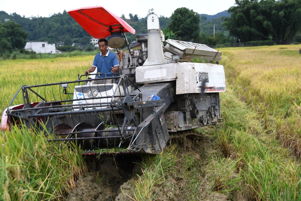 9月18日,在四川省宜宾市兴文县五星镇金钟村,农户驾驶收割机在“稻虾共作”田里收割水稻。新华社记者高健钧 摄