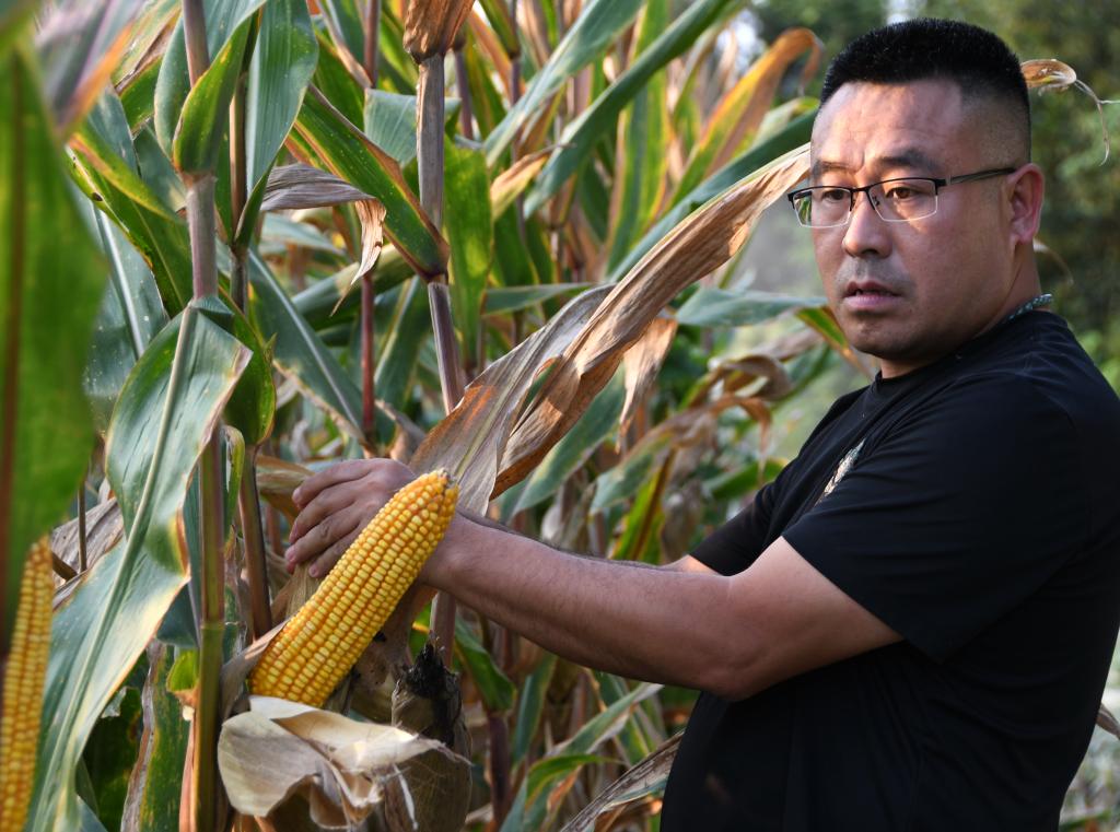 9月15日,在四川省三台县金石镇土城村,种粮大户何凯在玉米地里察看玉米长势。新华社记者高健钧 摄