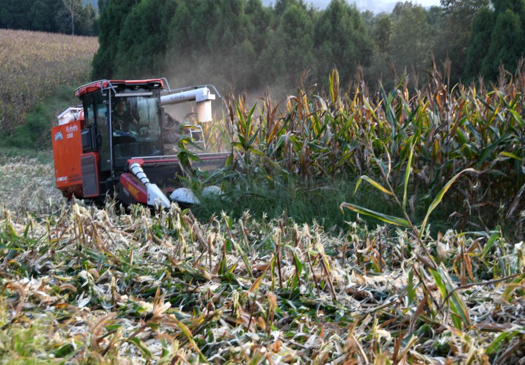 9月15日,在四川省三台县金石镇土城村,一台收割机正在收割玉米。新华社记者高健钧 摄