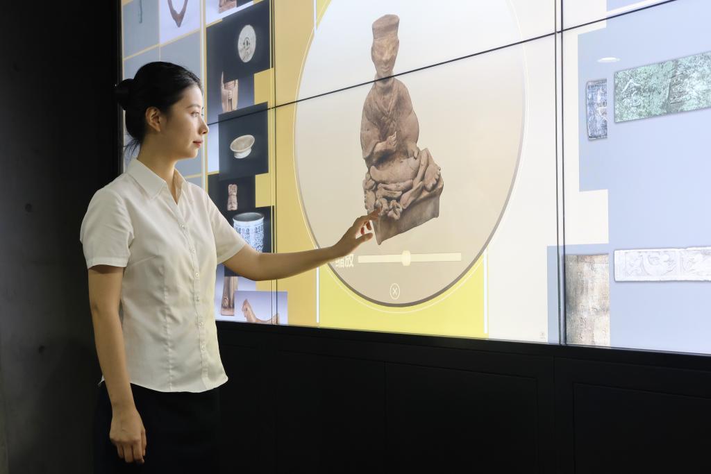 7月24日,在重庆三峡移民纪念馆,工作人员在展示用数字化呈现的藏品庖厨俑。新华社记者雷明宇 摄