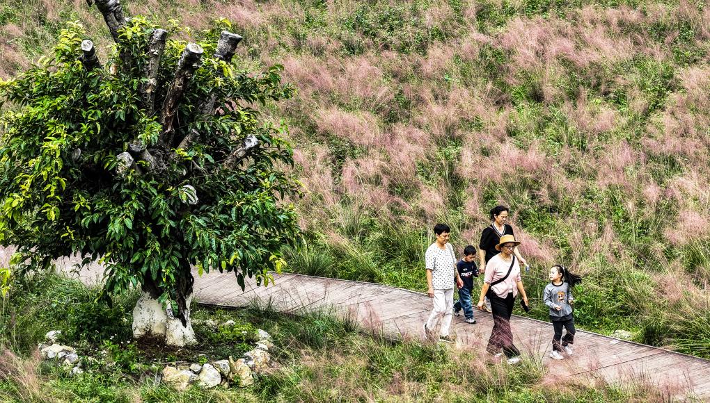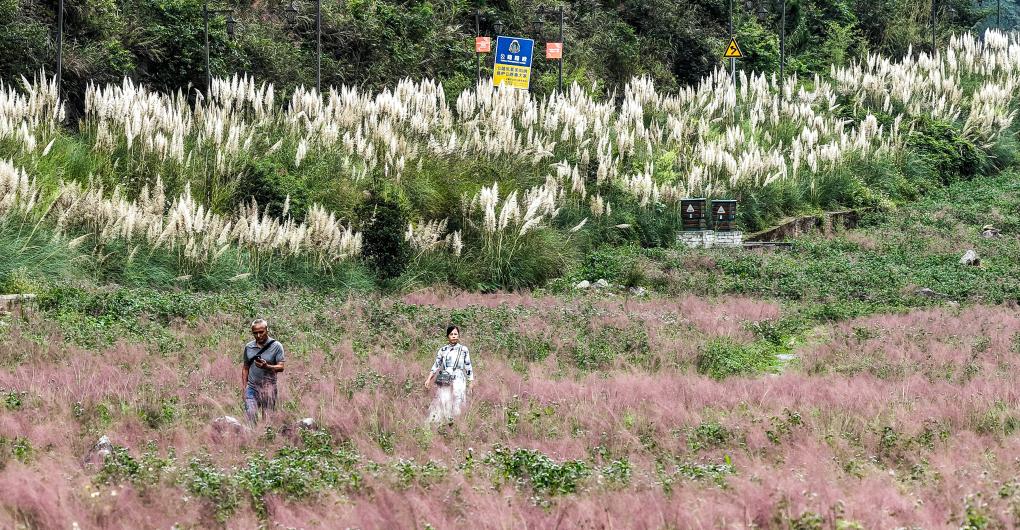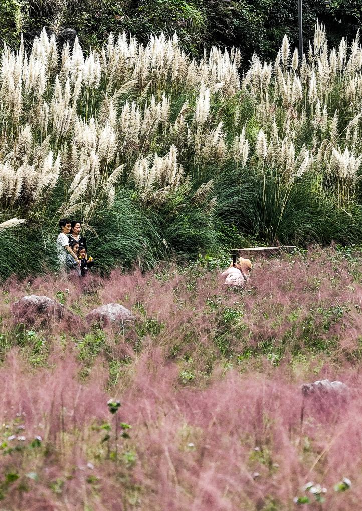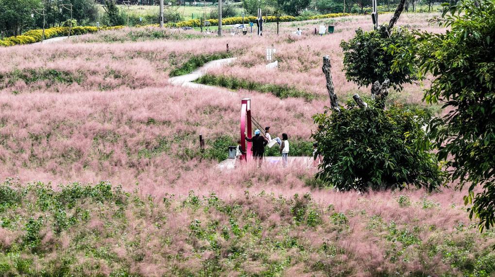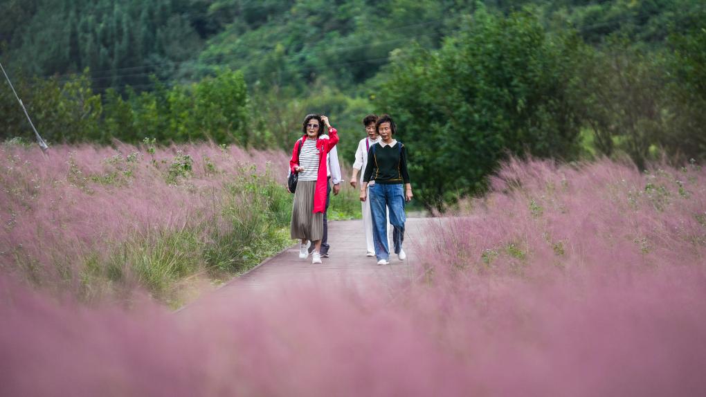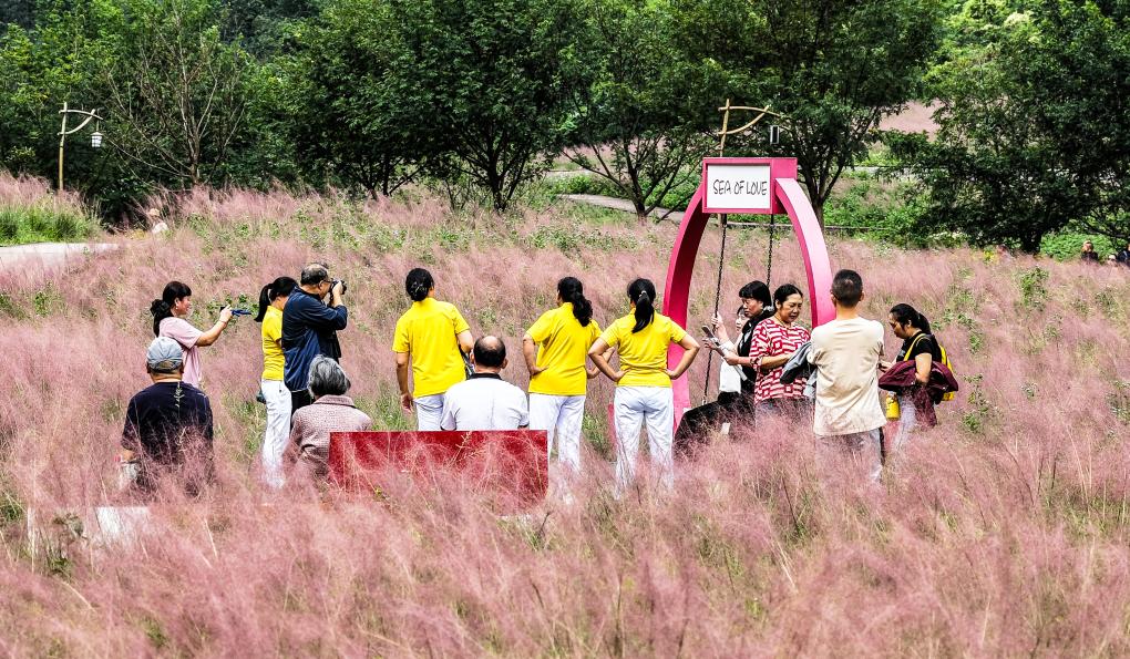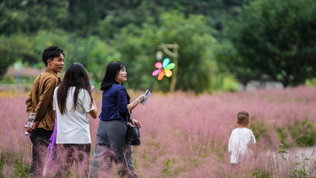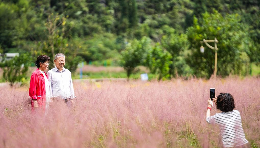 近日,贵州省黔南布依族苗族自治州长顺县神泉谷景区内的粉黛乱子草渐渐进入盛开期,成片的“粉色花海”吸引众多游客前来观赏游玩。