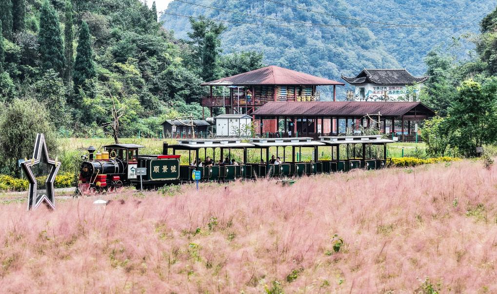 10月3日,游客在长顺县神泉谷景区内乘坐观光小火车游玩。