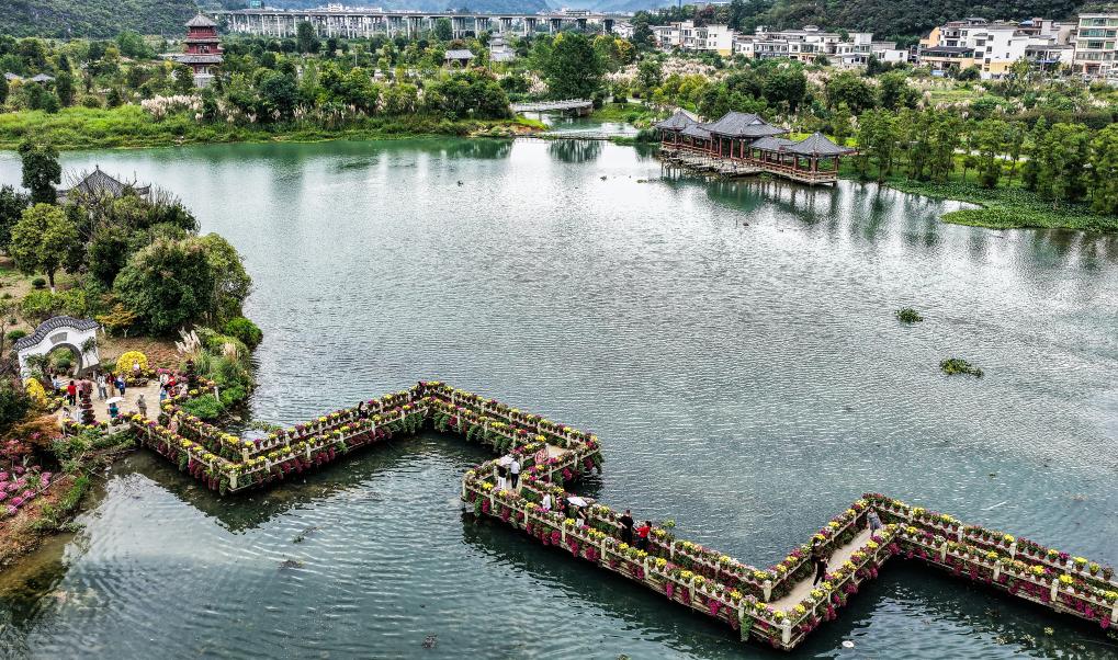 10月3日,游客在长顺县神泉谷景区内游玩(无人机照片)。