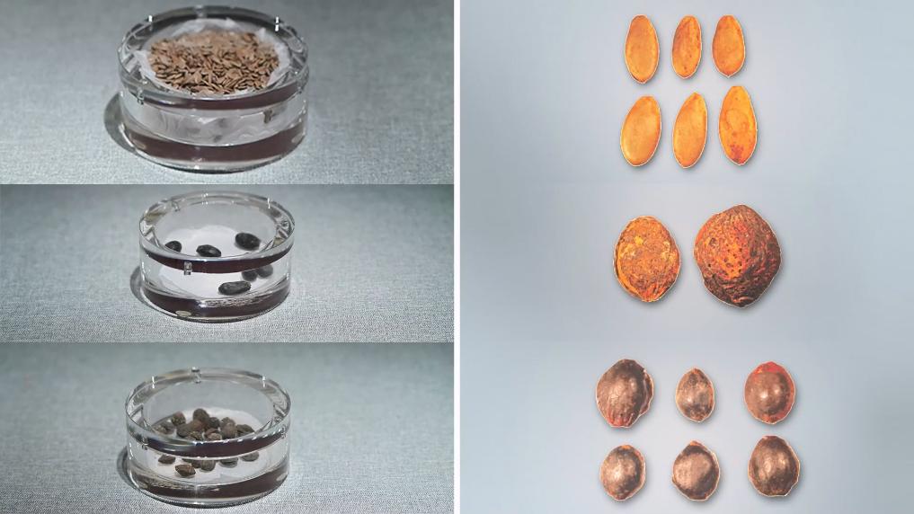 拼版图片:左图为南越王墓出土的植物种子;右图为海昏侯墓出土的植物种子。新华社记者袁慧晶制图