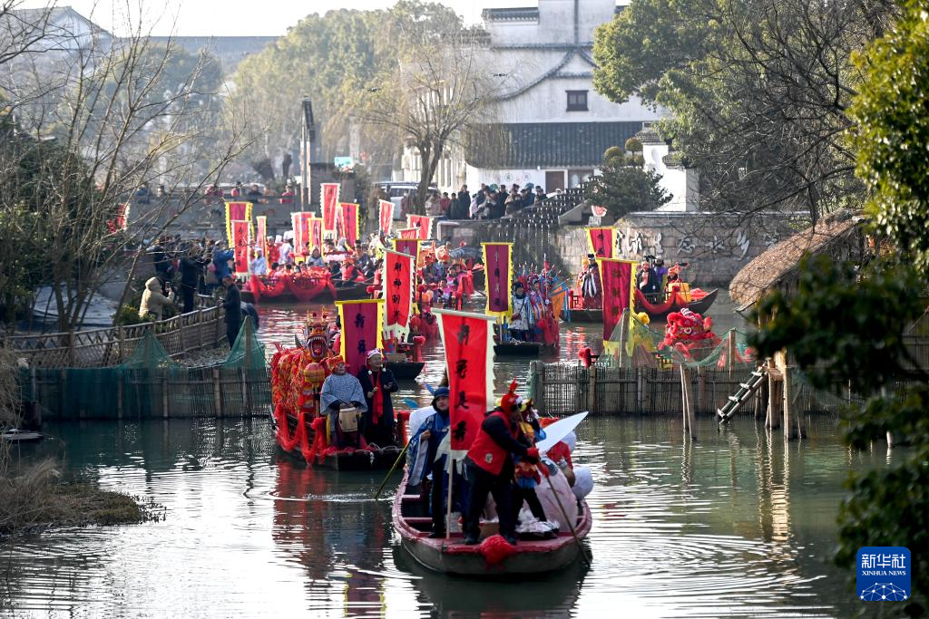 2023年1月26日,在浙江省湖州市南浔区和孚镇荻港村,渔船在水上古道巡游。新华社记者 黄宗治 摄