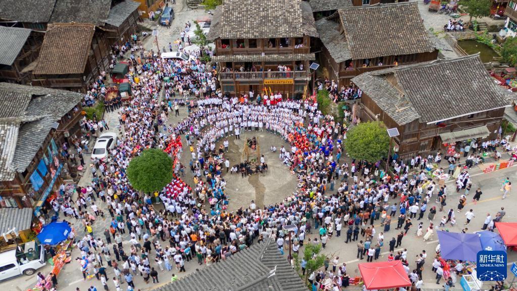 这是2024年7月20日在贵州省黎平县双江镇黄岗村拍摄的 “喊天节”活动现场(无人机照片)。新华社发(龙建睿 摄)
