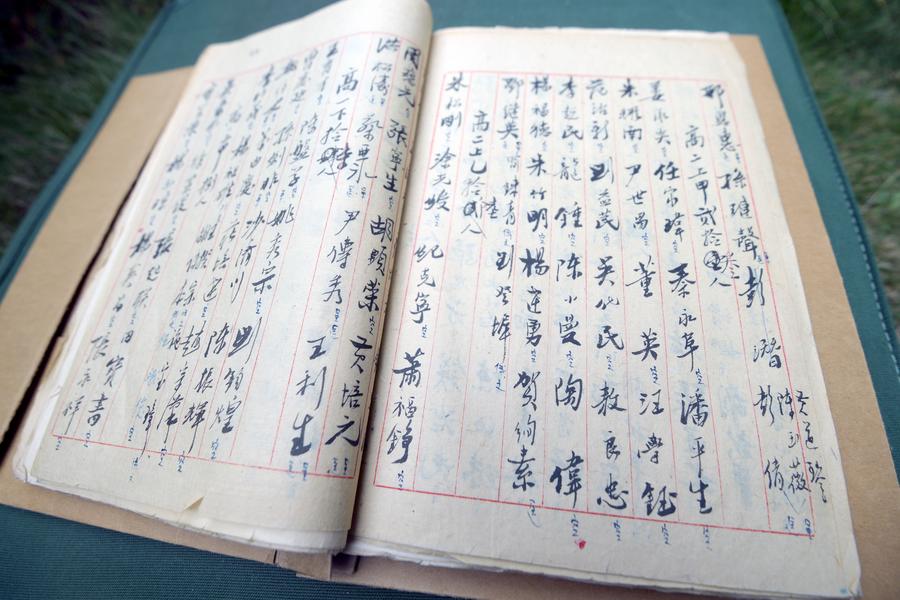 学校档案《关于学生参干名册(一九五〇—一九五一年)》上面记录着陶伟等学生参军参干的事迹。新华社发(史伟摄)