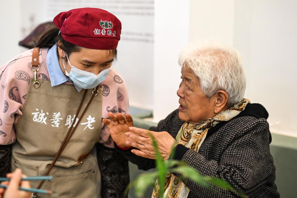 在贵阳市南明区红岩东郡社区诚善助老公益互助服务点,青年志愿者尹晓宣(左)在倾听就餐老人诉求(10月24日摄)。