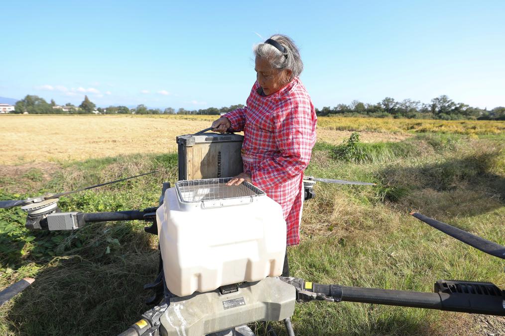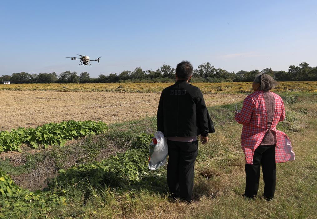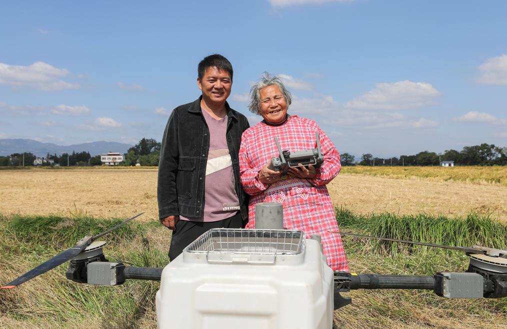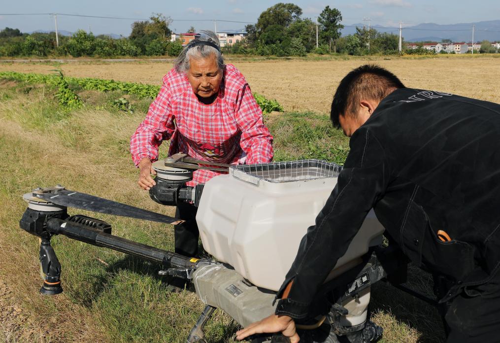 戴淑英(右)在王甜甜的指导下操作植保无人机。
