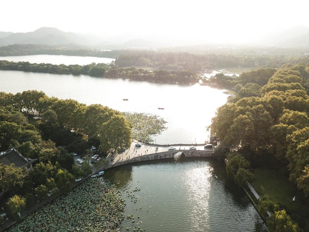 西湖孤山秋景,天气晴好,湖面涟漪,妩媚动人(无人机照片)。新华社记者 翁忻旸 摄