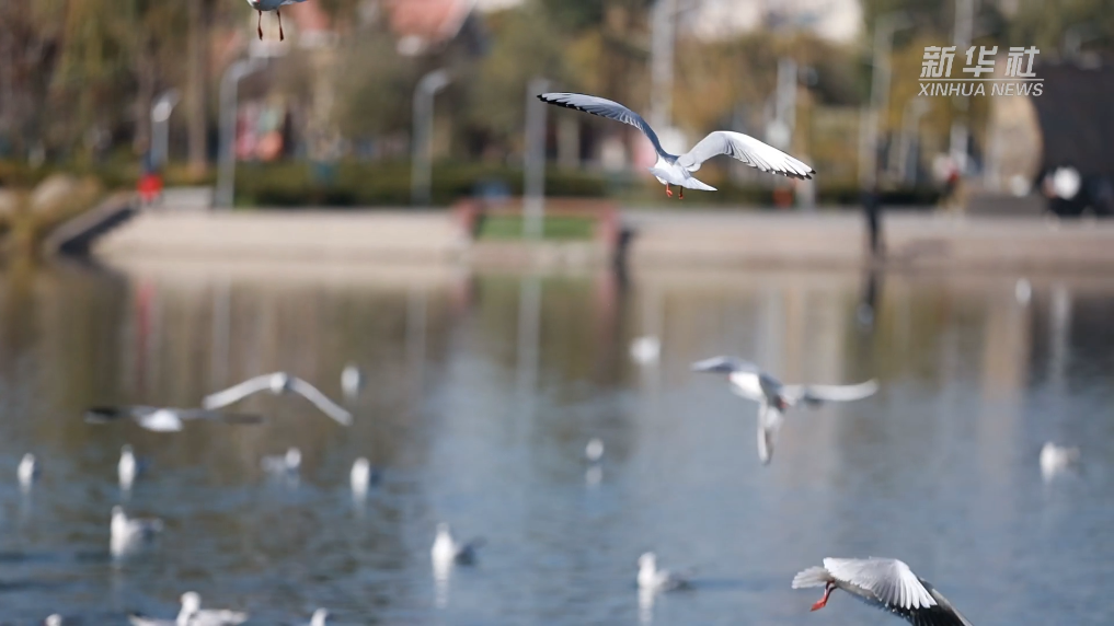 深秋时节,大批红嘴鸥“造访”宁夏银川市海宝公园,吸引众多市民前来观赏。