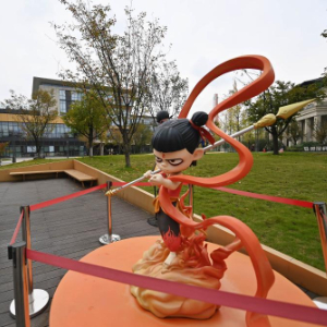 11月2日,市民从成都天府长岛数字文创园的哪吒形象雕塑旁走过。新华社记者肖潇 摄
