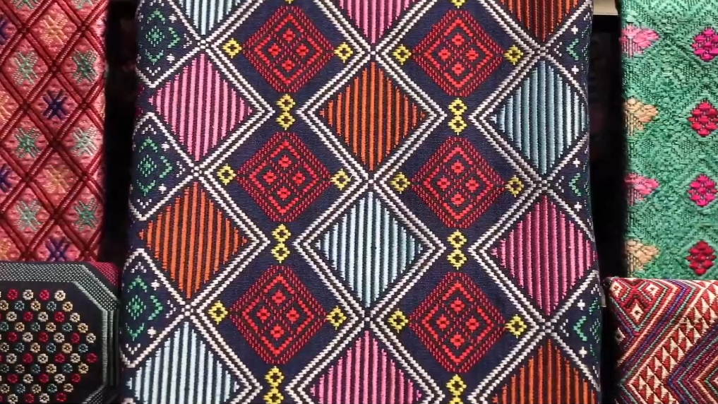 如今,壮锦的生产通过机械化,解决了宽幅和产量的问题,用途也从头巾、布袋、婴儿背带等传统物件,拓展至日常生活多个领域。