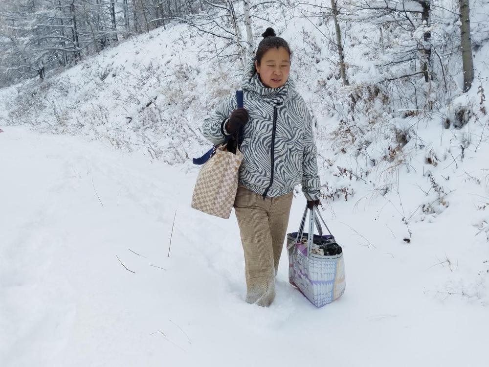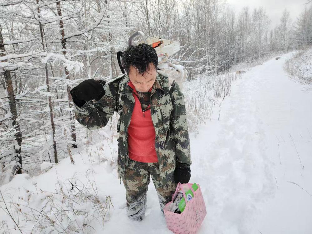 10月26日,孙忠全的妻子刘坤在摩天岭瞭望站搬运物资。(受访者供图)