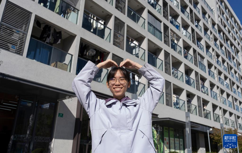 2025年11月13日,在上海的纳仕青年人才社区,南京大学计算机学院的何玉萍在自己居住的“青年驿站”前留影。 新华社记者 才扬 摄