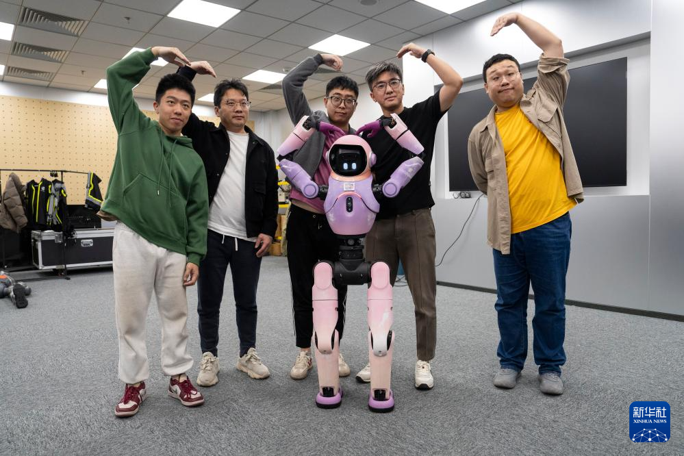 2025年11月12日,在上海的“模速空间”大模型创新生态社区,上海魂伴科技创始人兼CEO真地(右二)、青年研发人员同智能机器人合影留念。 新华社记者 才扬 摄