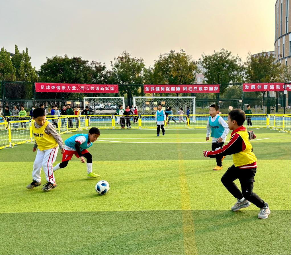 北京学校的学生在进行足球比赛。新华社记者 赵旭 摄