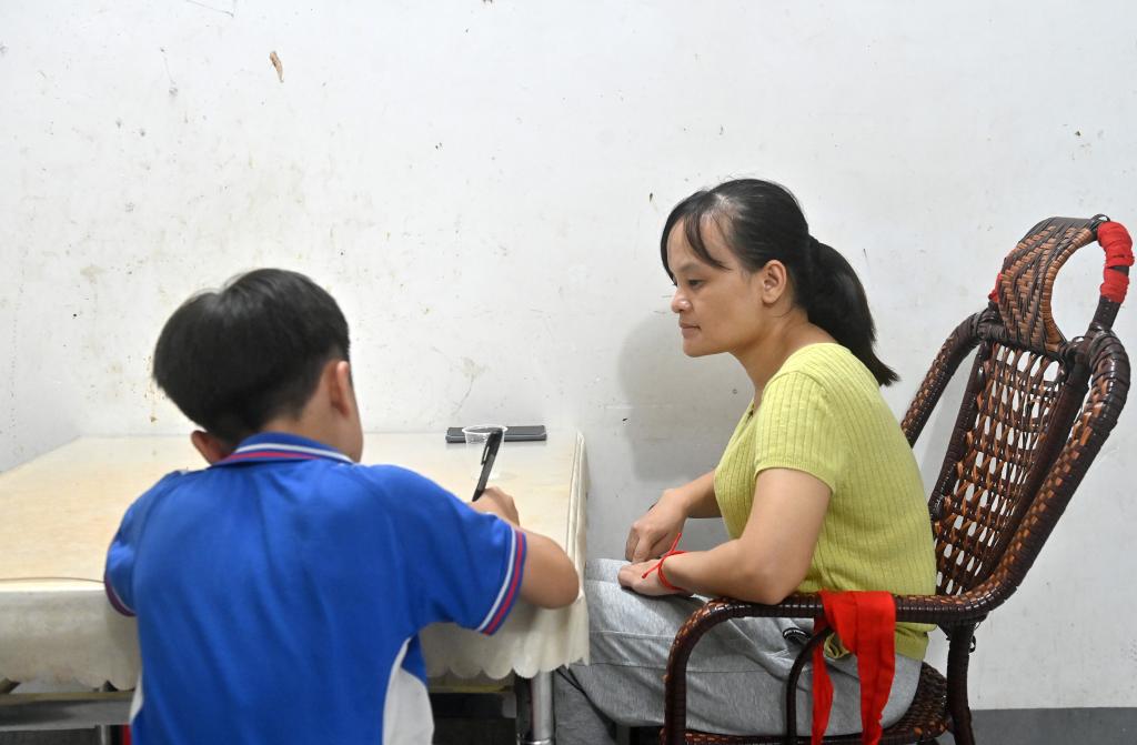 2025年10月13日,蓝野针陪着小儿子复习功课。