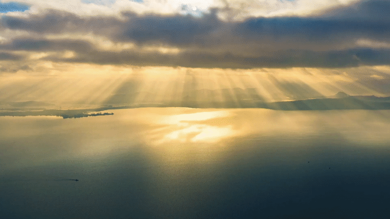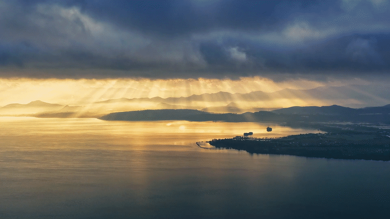 航拍镜头下,光束穿透云层倾泻而下,与滇池湖面交织出层次丰盈的光影画卷。