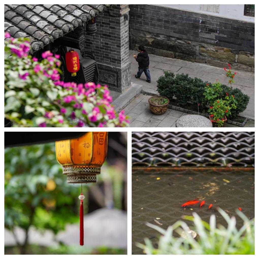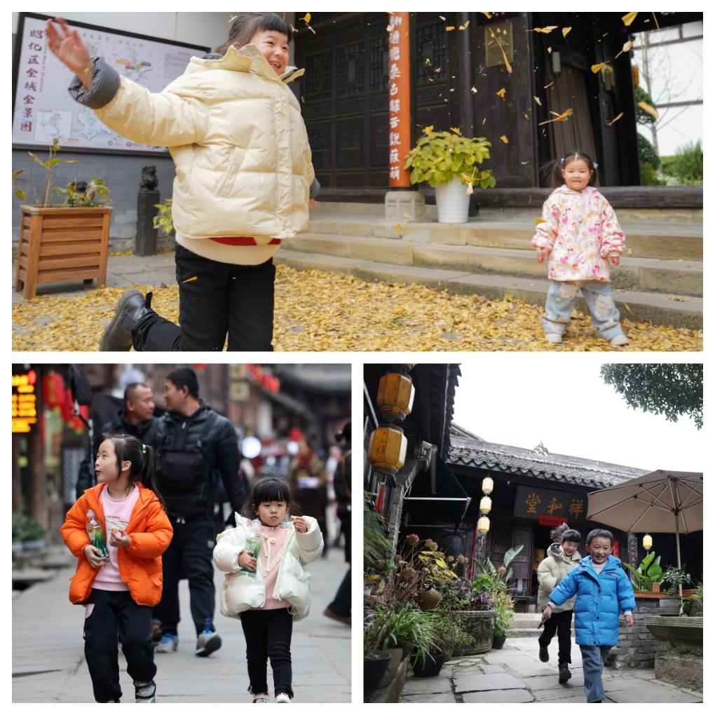 拼版照片:上图为游客在昭化古城观光游览(2025年12月12日摄);右下图为游客在昭化古城观光游览(2025年12月12日摄)。
