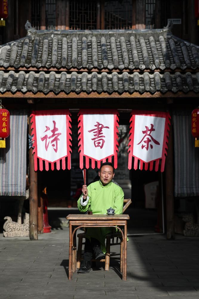 拼版照片:苟欢在表演评书(2025年12月13日摄)。