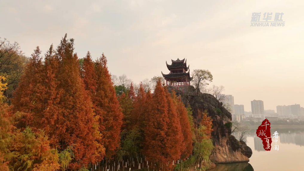 微风拂动,高大挺拔的水杉红叶轻摇,暖阳穿过树干,洒下斑驳光影,水杉林与砥柱矶上的亭外亭相映成趣,成为双清公园冬日里的一抹亮色。