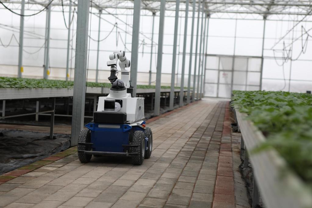 巡检机器人在定西马铃薯研究所联动温室内进行病害监测。新华社记者张睿 摄