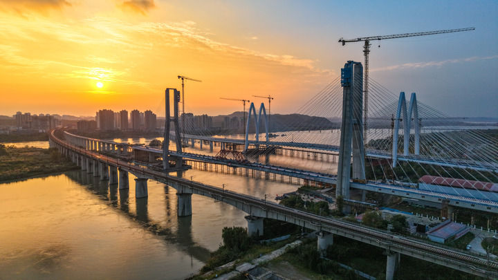 10月13日,落日时分下的成达万遂宁涪江特大桥。(费思童摄)