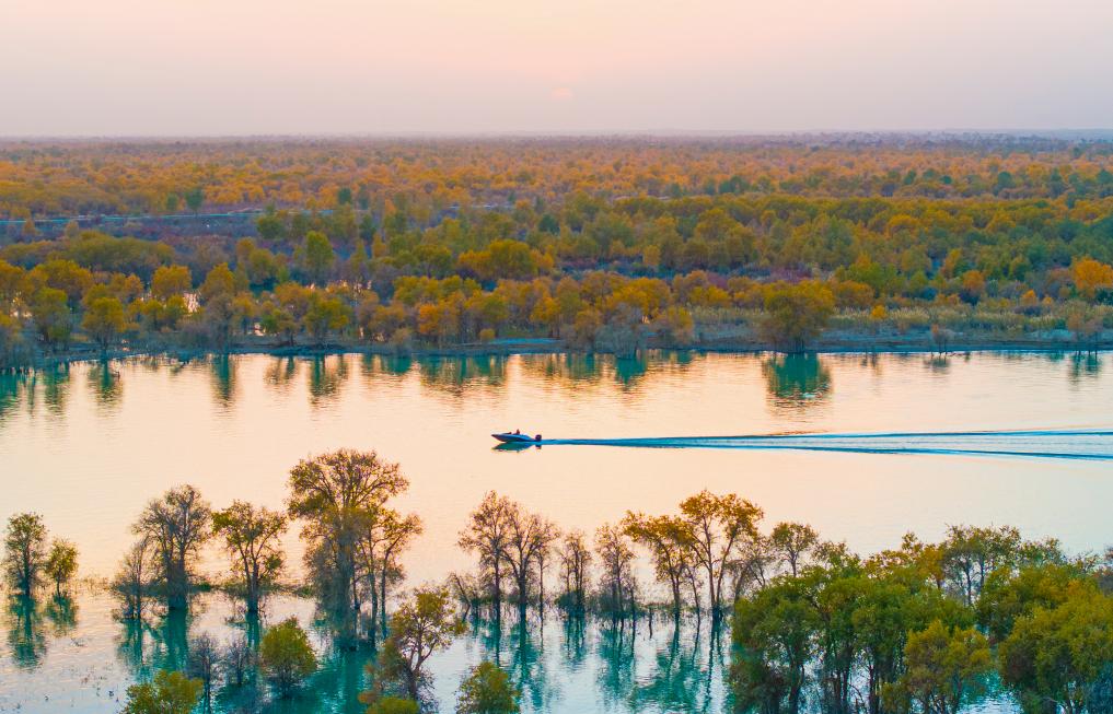 2025年10月17日,塔里木河与金色胡杨。新华社发(汪志鹏摄)