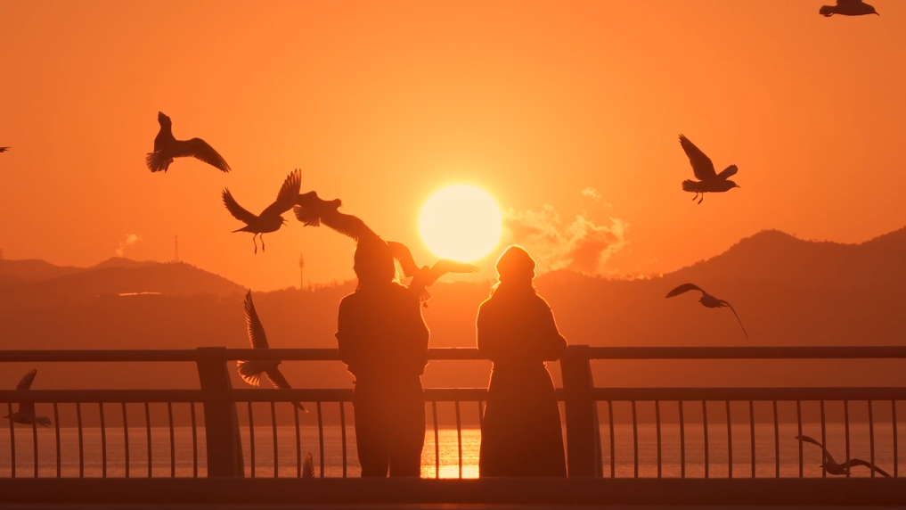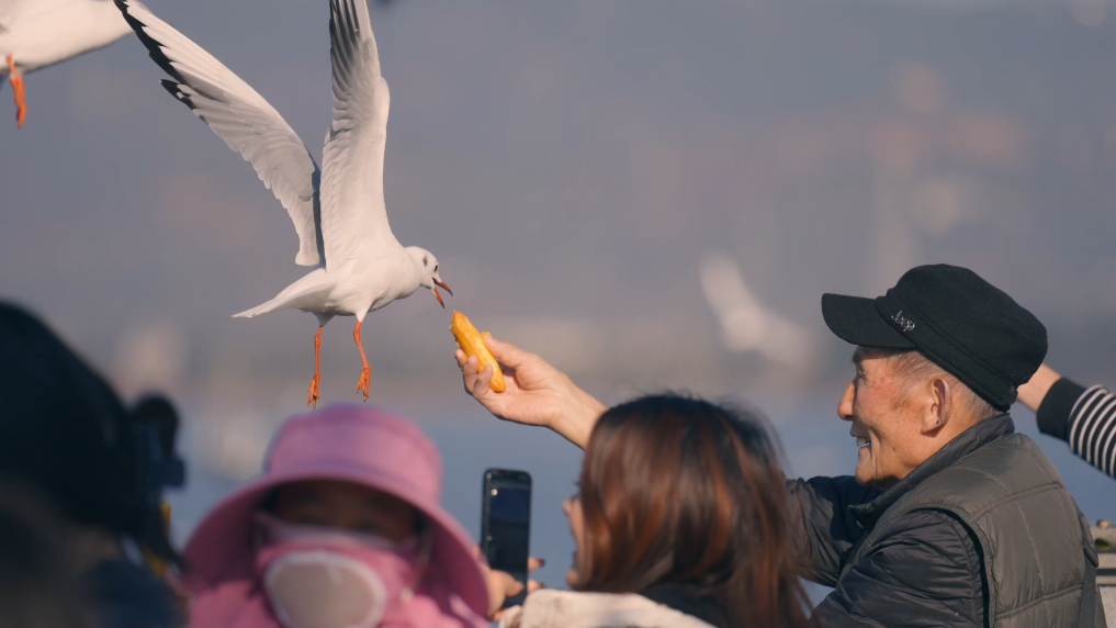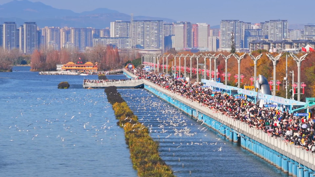 滇池岸畔,游人驻足观赏、拍照、投喂互动,鸥鸣声声,蓝天、碧水、白羽相映成景,勾勒出一幅人与自然和谐共生的冬日画卷。