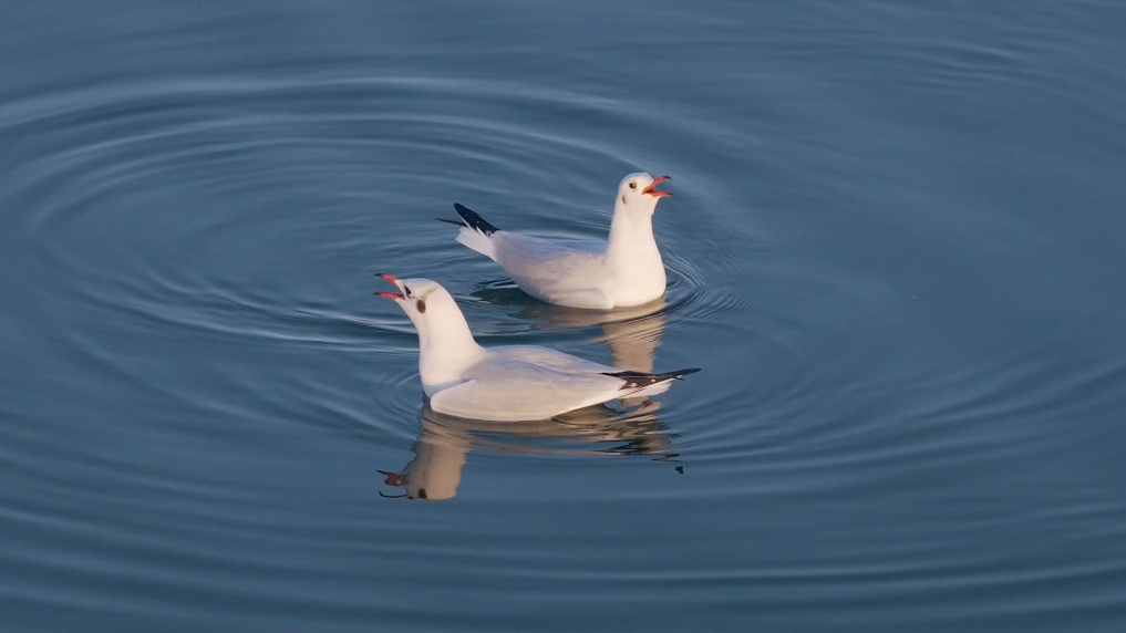 冬日暖阳下,红嘴鸥或振翅掠空,或悠然戏水,为静谧的湖面增添灵动生机。